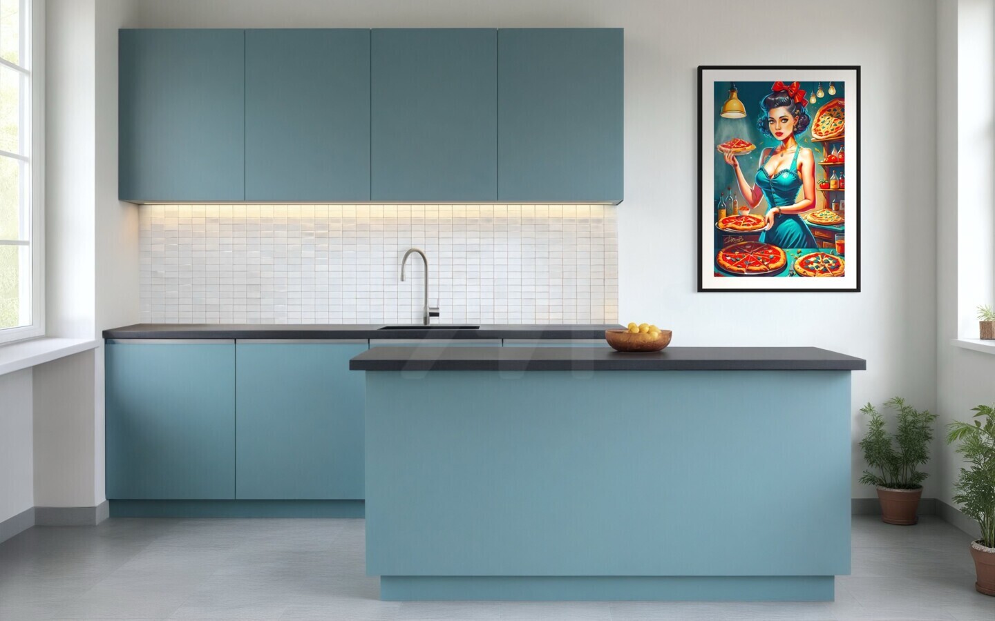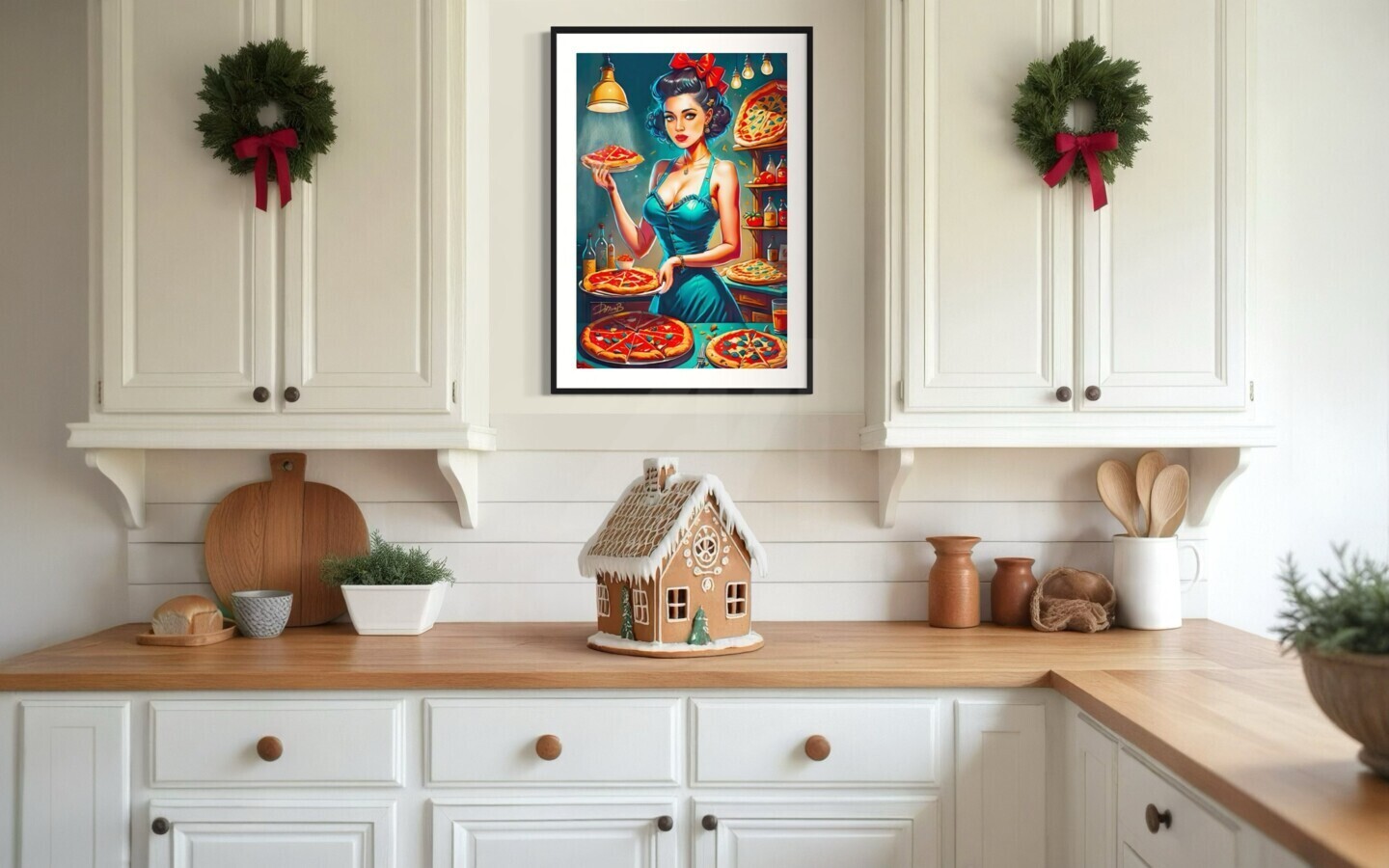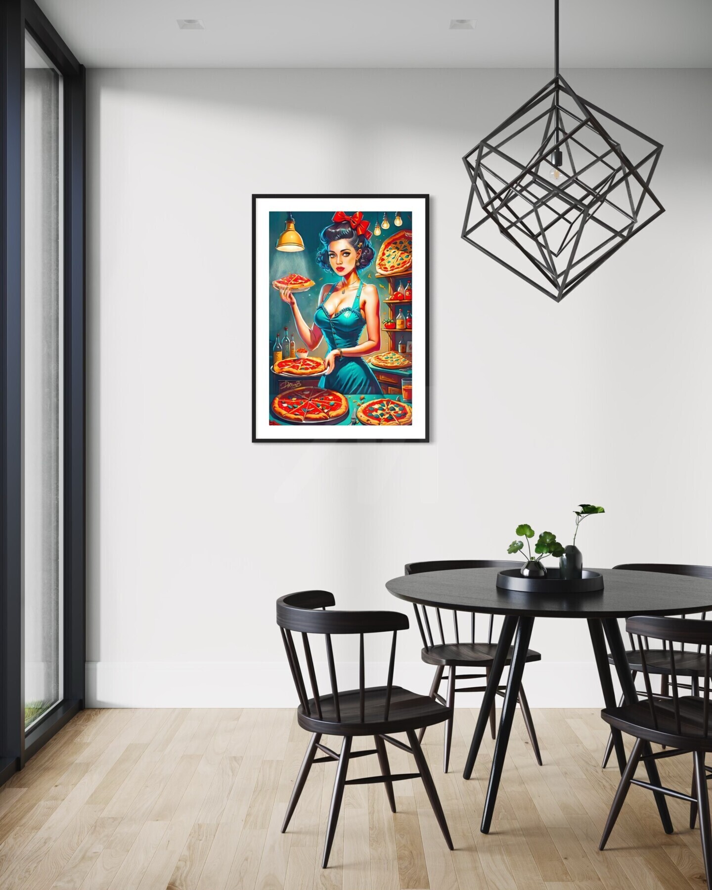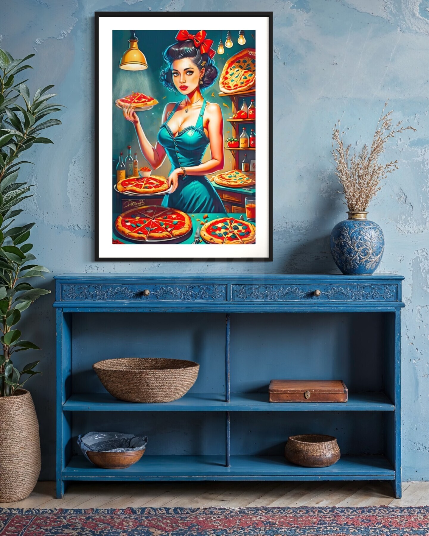 Cette image représente une femme de style pin-up, dans une cuisine, tenant une part de pizza. Elle est entourée de plusieurs pizzas entières, de bouteilles et d'un éclairage chaleureux, évoquant une atmosphère vintage et glamour. L'œuvre combine des éléments d'esthétique rétro avec un accent sur la nourriture savoureuse.