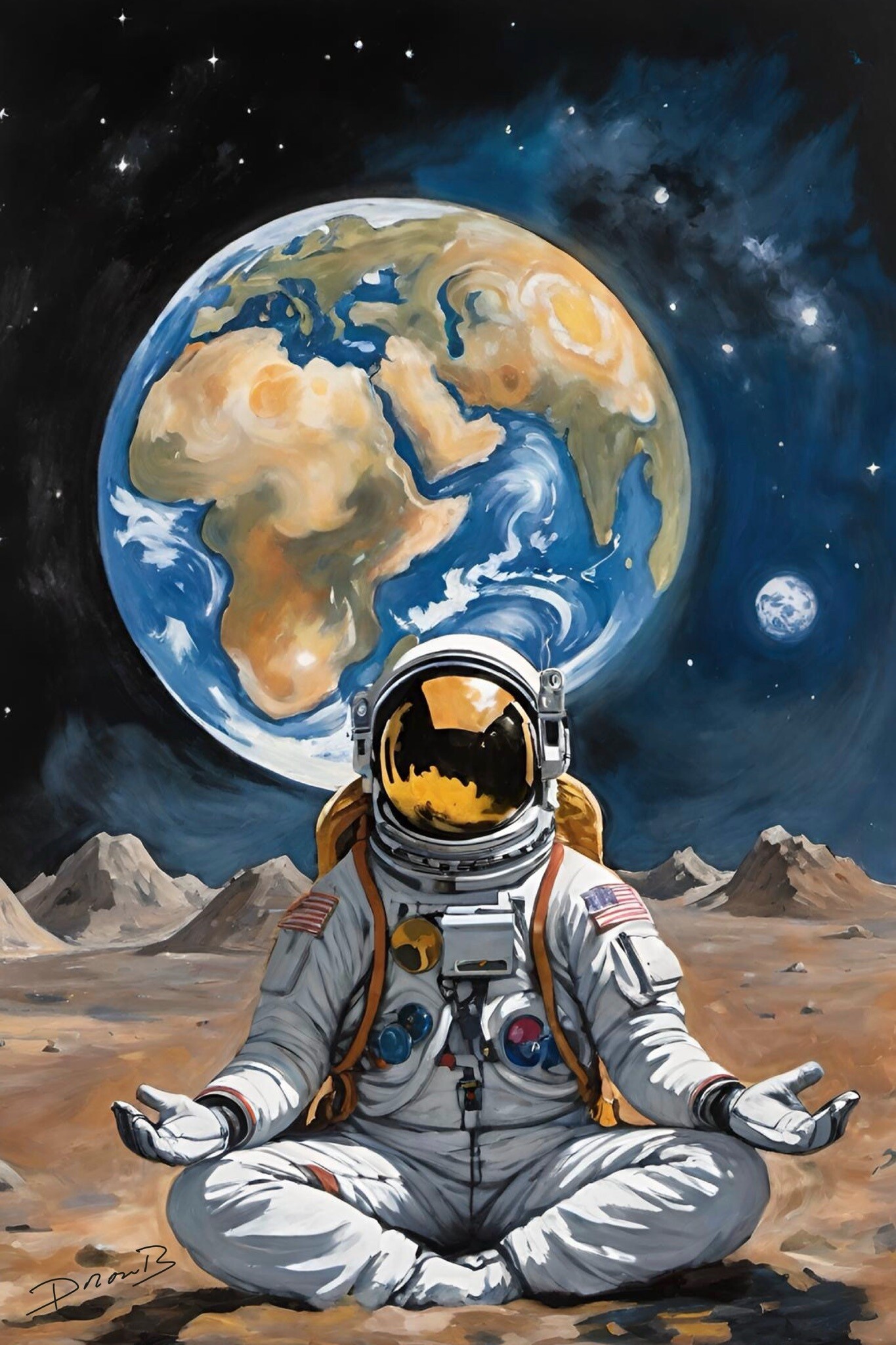 Un astronaute en scaphandre est assis en position du lotus sur un sol rocheux, probablement lunaire ou martien. En arrière-plan, une vue spectaculaire de la Terre domine le ciel noir parsemé d'étoiles, avec la Lune visible plus loin. Cette œuvre d'art capture un moment de profonde contemplation et de calme au milieu de l'immensité cosmique.