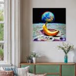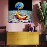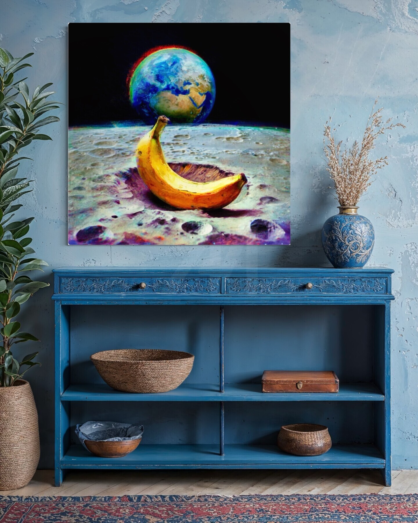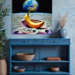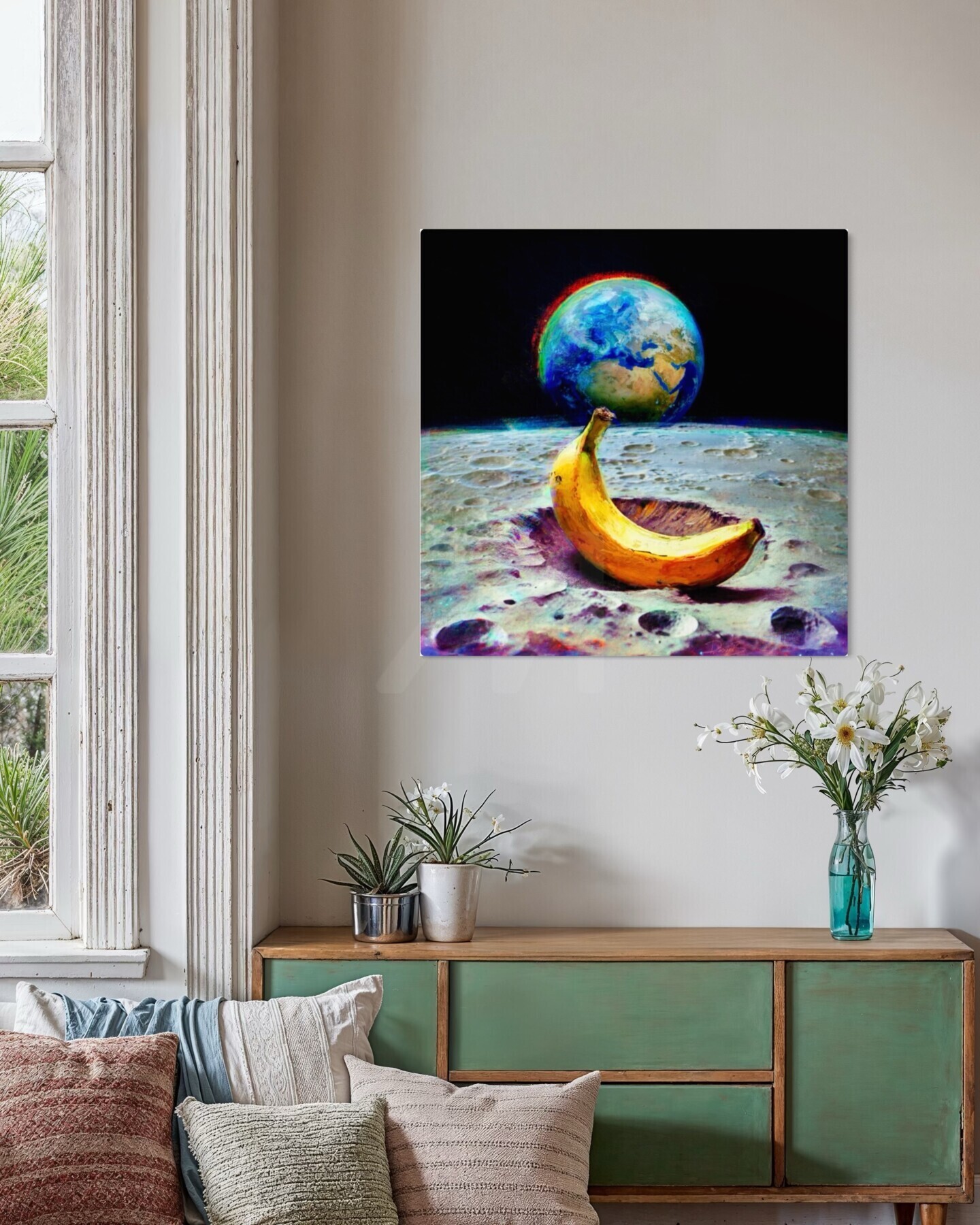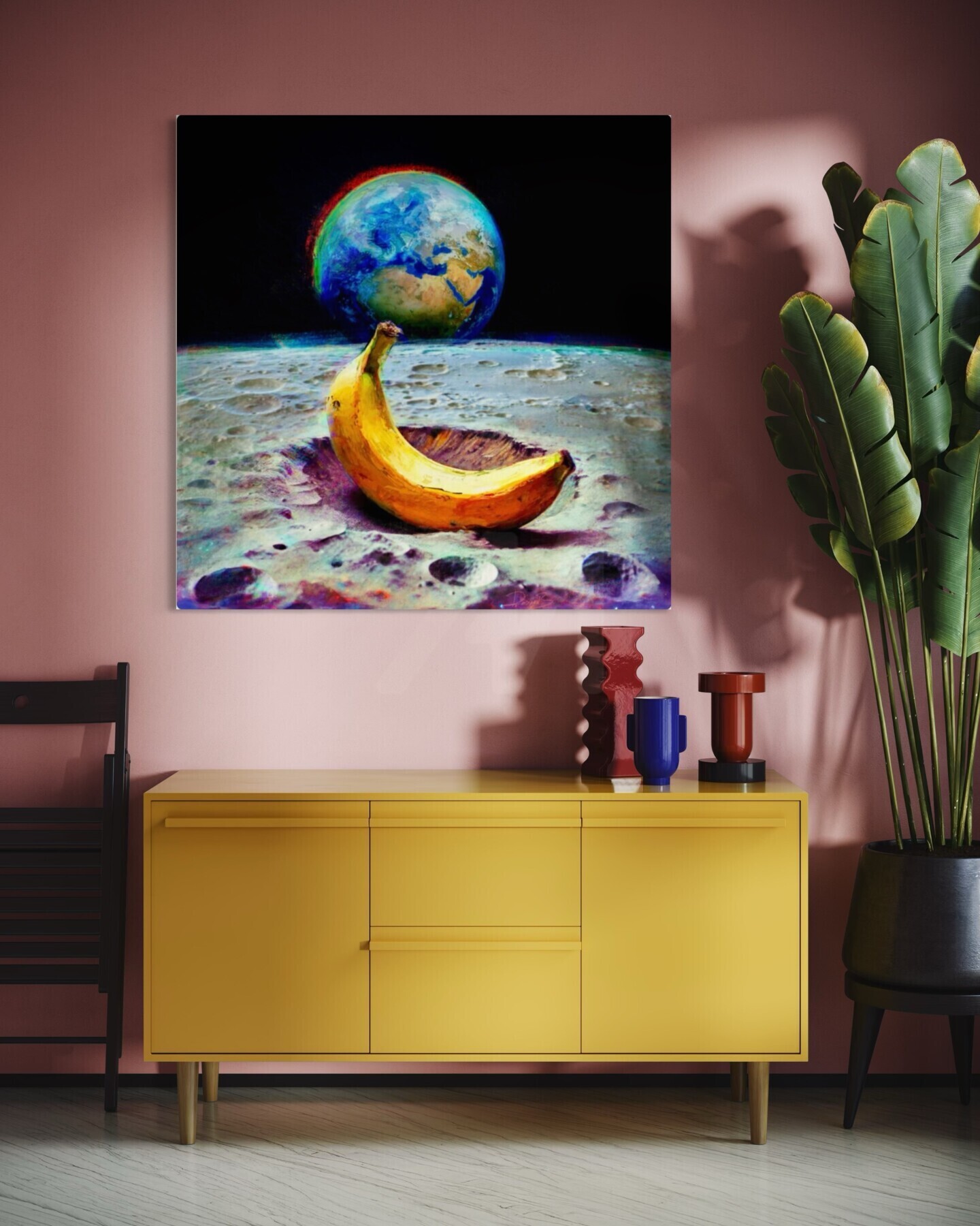 Dans cette œuvre, j'ai cherché à fusionner le surréalisme et la pop art dans un paysage numérique éblouissant. Sur la scène lunaire, une banane oversize repose, vibrant sous un ciel cosmique où la Terre se présente comme une sphère imposante et colorée. Ce tableau est un dialogue ludique entre familiarité et étrangeté, invitant à une réflexion sur notre perception de l'ordinaire dans un contexte extraordinaire. L'énergie de cette pièce dynamisera n'importe quelle pièce, apportant une touche de curiosité et d'émerveillement.