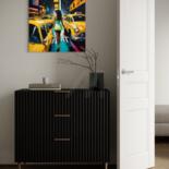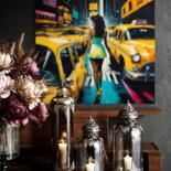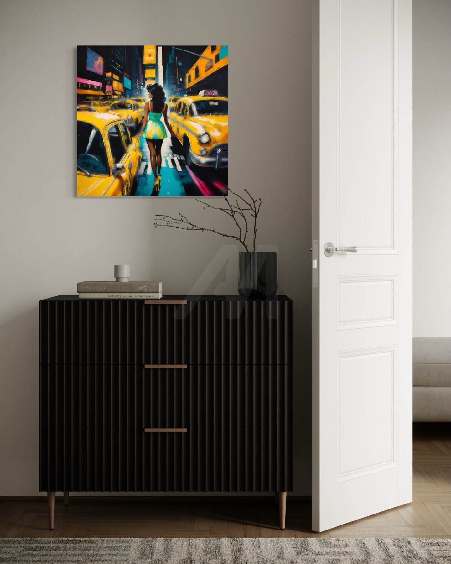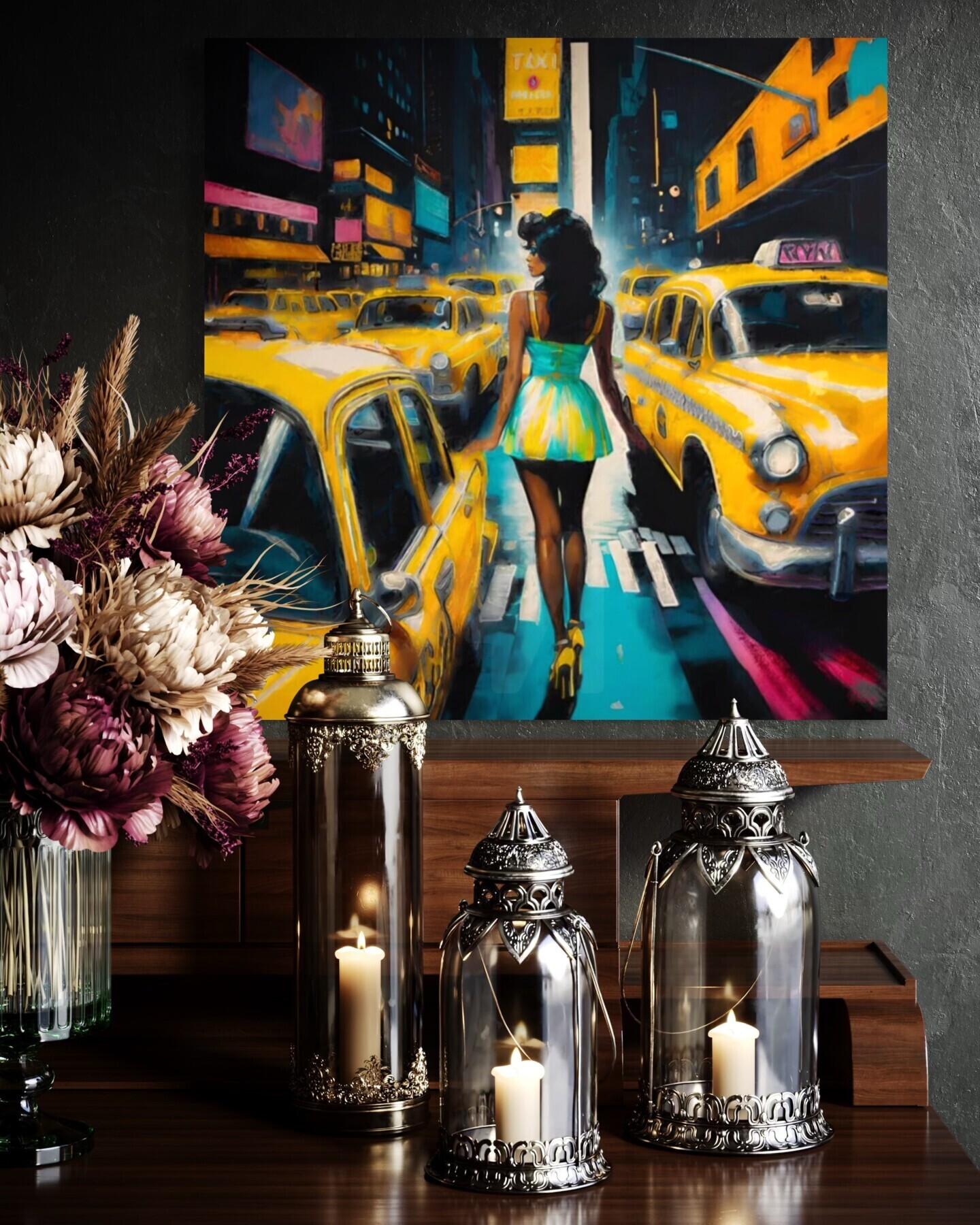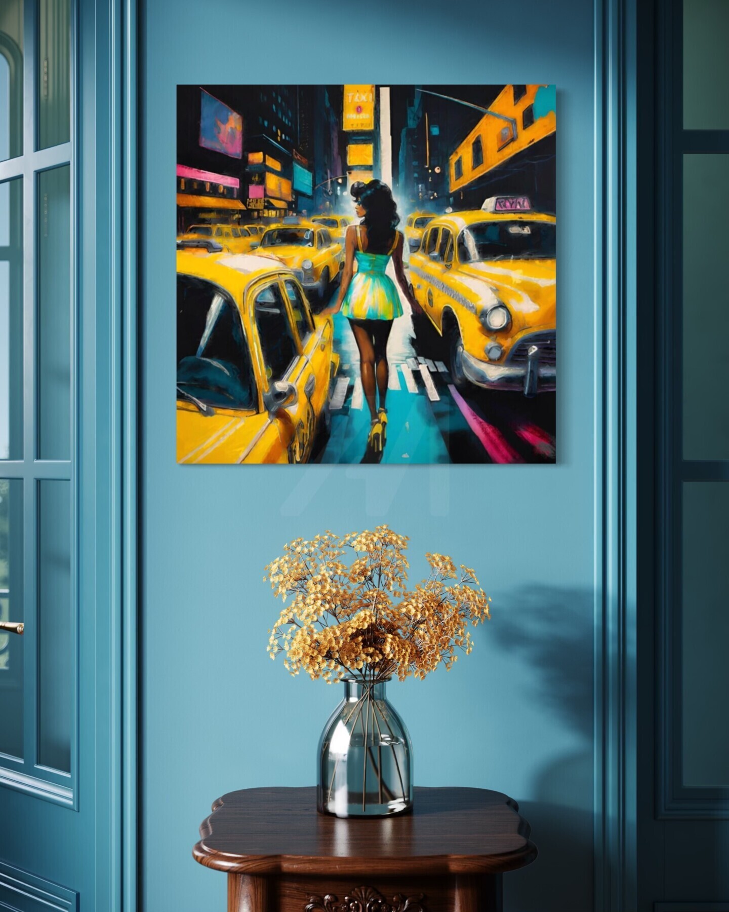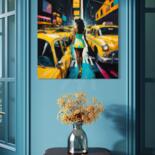 Une femme élégante, vêtue d'une robe courte et colorée, marche au milieu d'une rue animée de taxis jaunes. La scène nocturne, baignée par les lumières vives de la ville, évoque une atmosphère de glamour urbain et de style rétro. L'œuvre capture l'énergie vibrante d'une métropole la nuit.