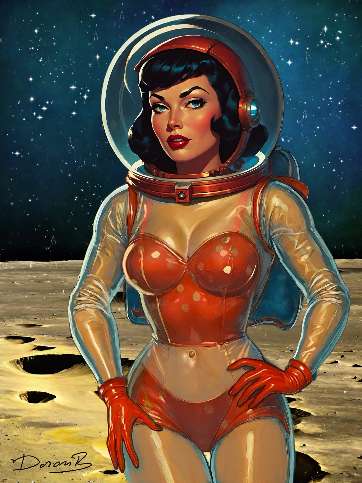 Cette illustration de style rétro-futuriste présente une femme séduisante vêtue d'une combinaison spatiale stylisée rouge et transparente, posant sur une surface lunaire accidentée. L'arrière-plan est dominé par un ciel nocturne profond parsemé d'étoiles brillantes, contrastant avec le sol jaune ocre.