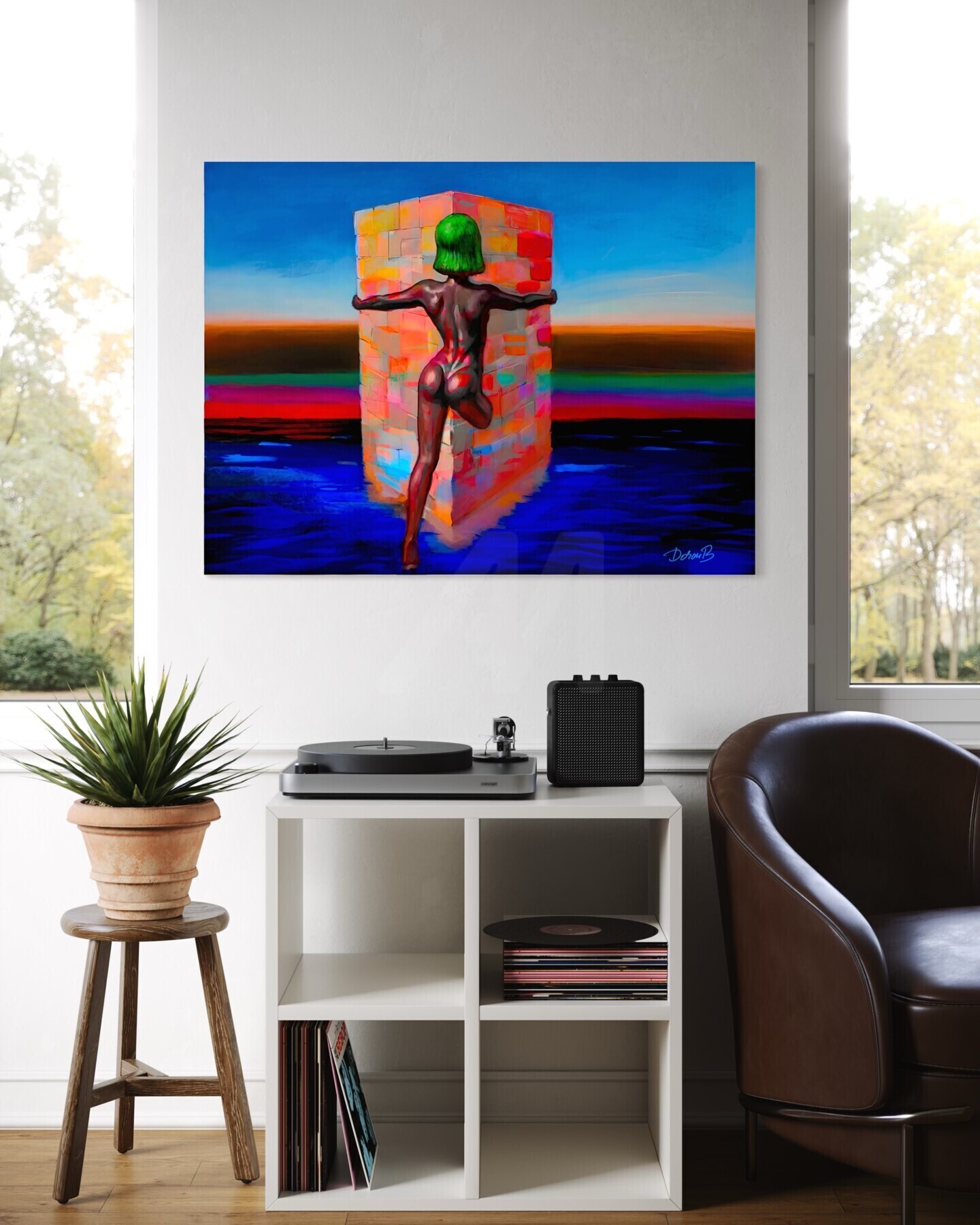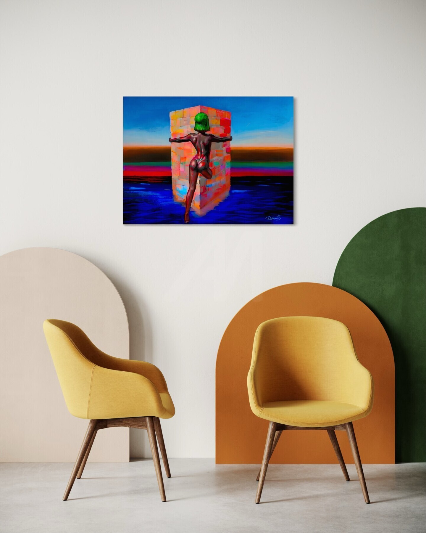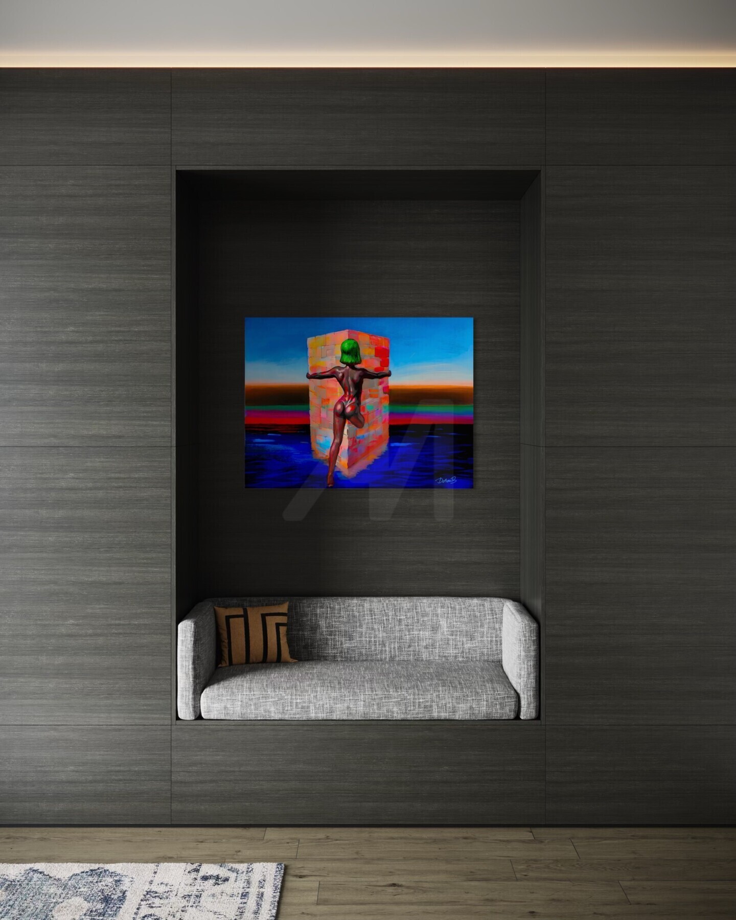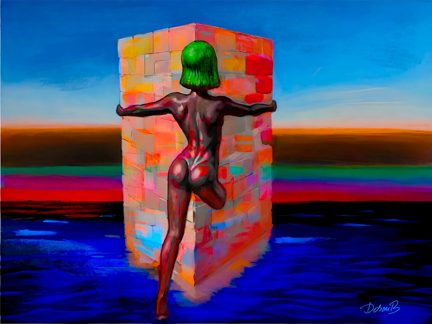 A stylized nude figure with vibrant green hair leans against a colorful, geometric prism. The scene unfolds in a surreal landscape featuring a deep blue ocean and a gradient sky transitioning from sunset hues to twilight. This digital artwork evokes a sense of mystery and abstract beauty.